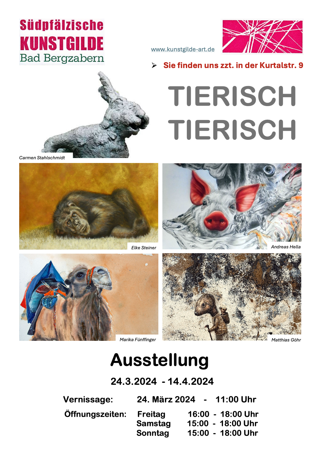 Eines haben alle fünf Künstlerinnen und Künstler bei dieser ersten Ausstellung bei der Kunstgilde gemeinsam: Motive aus der Tierwelt: Seien es Affen, Kamele, Hasen usw.- die Exponate begeistern in verschiedenen Techniken. Carmen Stahlschmidt, Elke Steiner, Marika Fünffinger und die Künstler Andreas Hella und Mathias Göhr sind die Fünfer-Gruppe, die bei der Südpfälzischen Kunstgilde die Eröffnungsausstellung des Jahres 2024 bestreiten. Musikalisch umrahmte Leon König mit dem Saxophon die Eröffnung, die Kunsthistorikerin Sabine Adler führte in die Werke ein. Die Werke können noch bis zum 14. April bewundert werden.